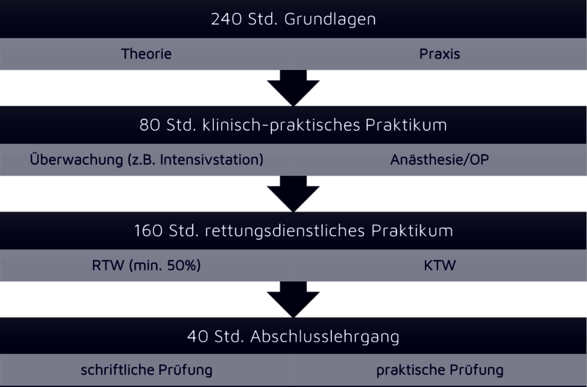Das klinische Praktikum muss die Abschnitte einer Überwachungsstation und einer anästhesiologischen Abteilung umfassen. Im Rahmen des rettungsdienstlichen Praktikums müssen mindestens 50% der Zeit auf einem RTW abgeleistet werden.