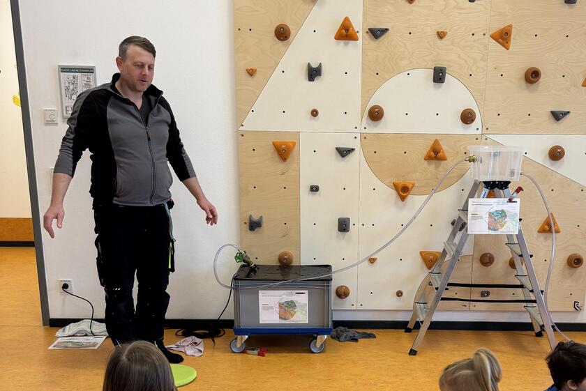 Andreas Freihart vom ortansässigen Wasserzweckverband erklärte den Kindern anhand praxisnaher Materialien wo das Wasser aus der Leitung herkommt sowie den Ablauf der verschiedenen Stationen. In kleinen Gruppen durchliefen die Kinder dann die Stationen. Unter anderem bauten die Kinder eine kleine Kläranlage, die den Verschmutzungsprozess des Wassers sichtbar machte. Bei einem weiteren Experiment erfuhren die Kinder den Unterschied zwischen Öl und Wasser. Abschließend gab es für jedes Kind einen „Wasserprofi-Orden“.