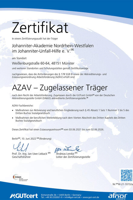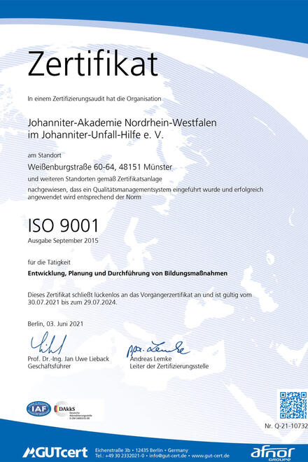 In der Johanniter-Akademie NRW qualifizieren wir Menschen im Sozial- und Gesundheitsbereich durch Aus-, Fort- und Weiterbildung und bieten ihnen dadurch berufliche Perspektiven sowie die Möglichkeit des lebenslangen Lernens. Der damit verbundenen Verantwortung sind wir uns voll bewusst. Deshalb lassen wir unsere Arbeit regelmäßig von unabhängiger Stelle sorgfältig überprüfen und zertifizieren. Die Qualität unserer Angebote und Leistungen befindet sich in einem fortlaufenden Bewertungs-, Sicherungs- und Entwicklungsprozess.