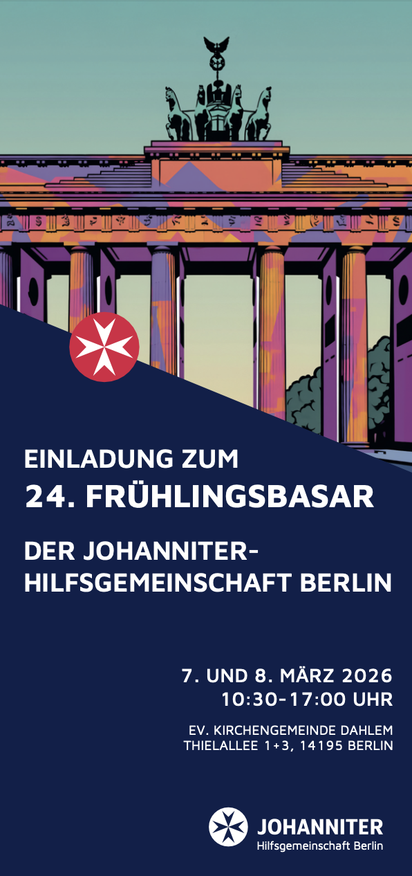 Der Frühlingsbasar der Johanniter Hilfsgemeinschaft Berlin findet seit dem Jahr 2000 jährlich kurz vor Ostern statt. Nach coronabedingter Unterbrechung in den Jahren 2020, 2021 und 2022 konnten wir den Basar 2023 wieder fest in unsere Jahresplanung aufnehmen. 2026 findet der Frühlingsbasar daher nun schon zum 24. Mal statt - am Wochenende 7./8. März von 10.30-17.00 Uhr wie immer in der ev. Kirchengemeinde Dahlem. Alle Einnahmen aus dem Basar kommen unseren zahlreichen sozialen Projekten in Berlin und Brandenburg zu Gute.