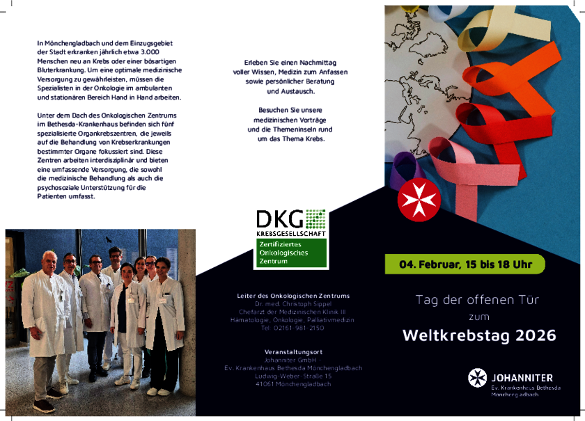Anlässlich des Weltkrebstags lädt das Evangelische Krankenhaus Bethesda am 4. Februar zu einem Tag der offenen Tür ein. Unter dem Motto “Qualität und Menschlichkeit in der Krebsbehandlung” erhalten Interessierte umfassende Einblicke in die Arbeit des von der Deutschen Krebsgesellschaft zertifizierten Onkologischen Zentrums im Bethesda-Krankenhaus.