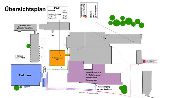 Am Krankenhaus befinden sich Parkplätze (Zufahrt über Ludwig-Weber-Straße), diese sind allerdings begrenzt.
