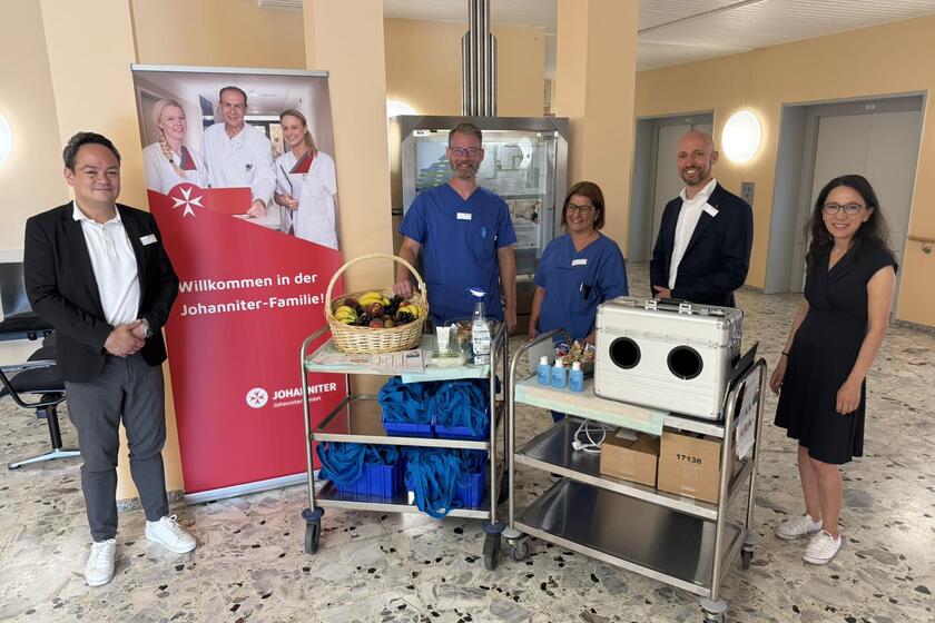 Die korrekte Desinfektion der Hände gehört im Ev. Lukas-Krankenhaus Gronau zur selbstverständlichen Routine und sitzt sowohl bei Pflegekräften, Ärzten als auch bei Therapeuten. Die eigene Handhabung regelmäßig zu überprüfen, ist dennoch sinnvoll und wichtig. Deshalb lud die Krankenhaushygiene am heutigen Dienstag, 12. August, die Mitarbeitenden dazu ein, ihre frisch desinfizierten Hände zur Überprüfung der eigenen Technik in die Blackbox zu halten. Das Schwarzlicht deckte Stellen auf, die eventuell zu wenig oder gar kein Desinfektionsmittel abbekommen hatten. Das Fazit, das Kristin Niemeier, Hygienefachkraft in Weiterbildung, und ihr Kollege Frederik Schwar, Hygienefachkraft der Johanniterkliniken Hamm, zogen: „Die Kolleginnen und Kollegen machen das super. Wir hatten kaum etwas zu beanstanden.“