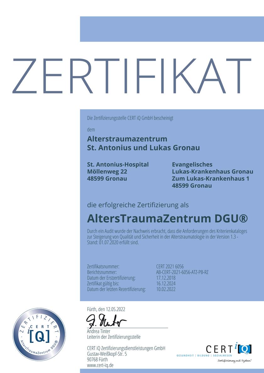 Wir sind zertifiziert! Die Alterstraumatologie St. Antonius und Lukas-Krankenhaus ist seit Oktober 2018 durch die DGU zertifiziert. Nach einem aufwendigen und arbeitsintensiven Prozess wurde das Siegel nach Gronau vergeben.