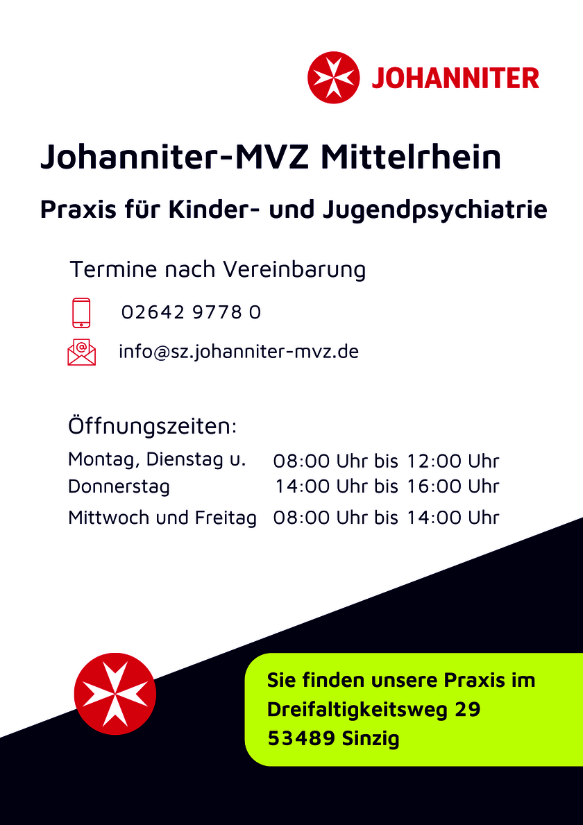 Die Johanniter-MVZ Mittelrhein Kinder- und Jugendpsychiatrie Praxis in Sinzig befindet sich vom 22.12. - 28.12.2025 im Urlaub.