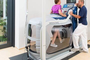 Das Anti-Schwerkraft-Laufband „Alter G“ermöglicht ein Gangtraining mit bis zu 80 Prozent reduziertem Körpergewicht. Das kommt dem Behandlungserfolg nach Verletzungen der unteren Extremitäten, bei der Gangschulung im Falle von Arthrosen und bei neurologischen Erkrankungen zugute.