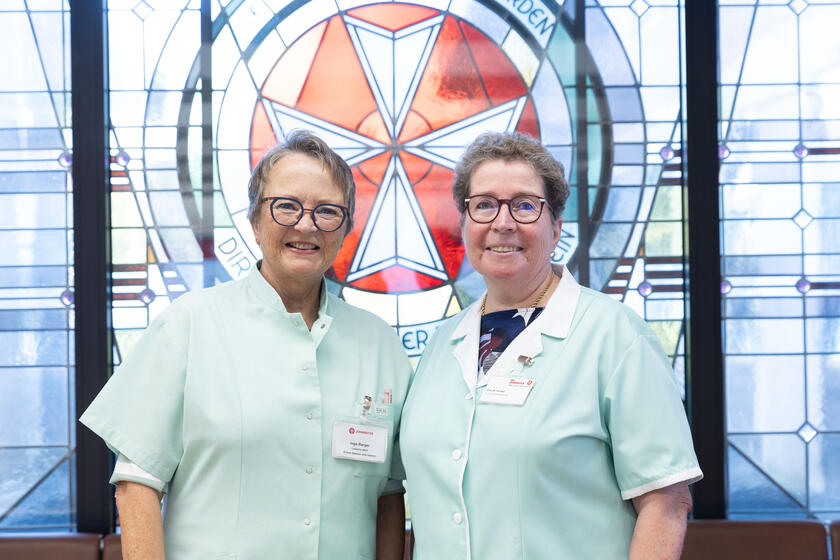 Leitung der Grünen Damen und Herren in den Johanniter-Kliniken Bonn, links Inge Berger, rechts Marianne Henkel