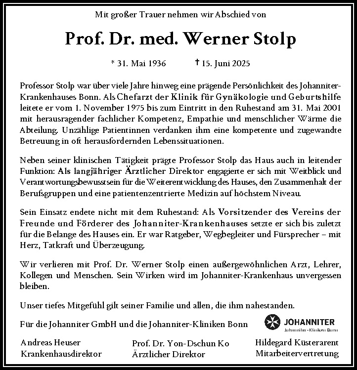 wir möchten mit Ihnen zusammen an unseren verstorbenen, ehemaligen Ärztlichen Direktor und Chefarzt der Gynäkologie, Herrn Prof. Dr. Werner Stolp denken und ihn in einem gemeinsamen Gottesdienst würdigen. Herr Prof. Stolp war auch langjähriger Vorsitzender unseres „Verein der Freunde und Förderer des Johanniter-Krankenhauses Bonn e.V.“. Die Andacht soll am Freitag, 04. Juli 2025 um 10.00 Uhr in der Krankenhauskapelle im Johanniter-Krankenhaus stattfinden.