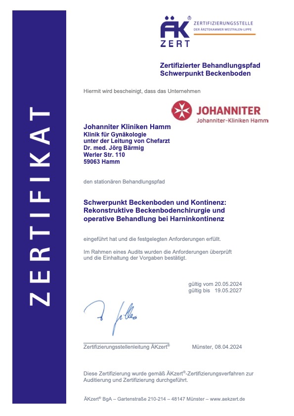 Dr. med. Jörg Bärmig, Chefarzt des Zentrums, ist von der Arbeitsgemeinschaft für Urogynäkologie und plastische Beckenbodenrekonstruktion zertifiziert.