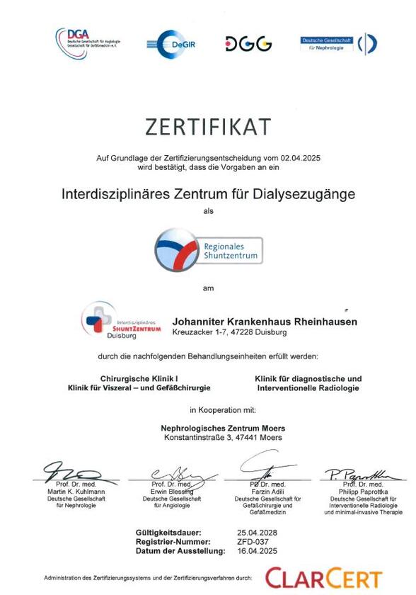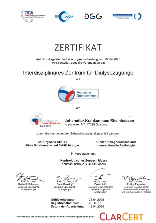 Unser interdisziplinäres Shuntzentrum Duisburg am Johanniter Krankenhaus Rheinhausen gehört zu diesen Kliniken und konnte sein hohes Qualitätsniveau kürzlich mit einem Zertifikat bestätigen.