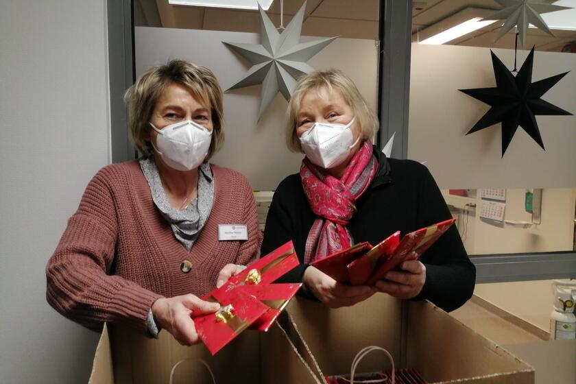 Alle Mitarbeiter wurden zu Punsch, Stollen und Berlinern eingeladen. Als besonderes „Danke-schön“ wurde an jeden persönlich ein Geschenk-Gutschein übergeben. Wie auch im letzten Jahr haben die Verteilung Krankenhausdirektorin Frau Töben und Pflegedirektorin Frau Oberin Theuner übernommen.