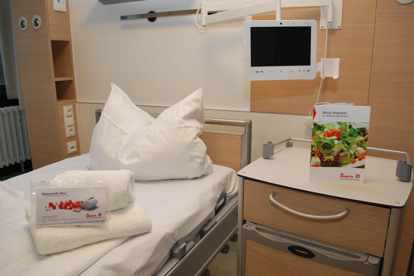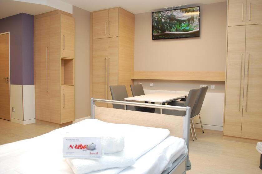 Wir möchten, dass Sie sich als Patienten in unserem Krankenhaus wohlfühlen und in einem angenehmen Ambiente genesen können. Dazu bieten wir Ihnen in höher ausgestattete Wahlleistungszimmer an. Diese sind ansprechend und wohnlich eingerichtet und verfügen u.a. über einen eigenen Sanitärbereich mit Dusche und WC, einen Safe und Kühlschrank.