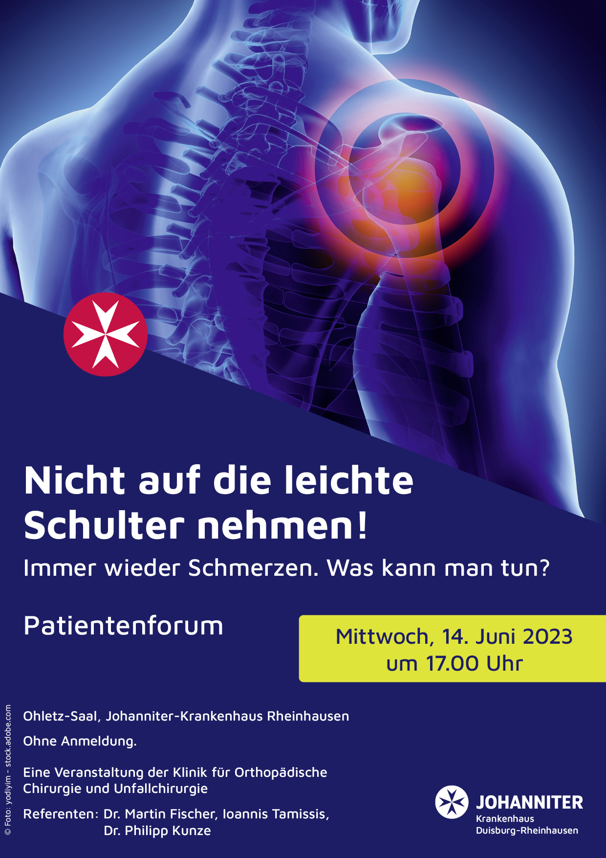 Über die vielfältigen Behandlungsmöglichkeiten der Schulterprobleme informieren die Fachärzte der Klinik für Orthopädische Chirurgie und Unfallchirurgie am Mittwoch, 14. Juni 2023 im Ohletz-Saal des Johanniter-Krankenhauses Rheinhausen. Begonnen wird um 17.00 Uhr mit dem Vortrag von Oberarzt Dr. Philipp Kunze zum Thema „nichtoperative Behandlung der Schulterschmerzen und Versorgung von Brüchen“, gefolgt von Oberarzt Ioannis Tamissis zum Vortrag „Arthroskopische Verfahren / Schlüssellochtherapien“ und im Anschluss Chefarzt Dr. Martin Fischer zu den Möglichkeiten des Gelenkersatzes, der Endoprothetik.