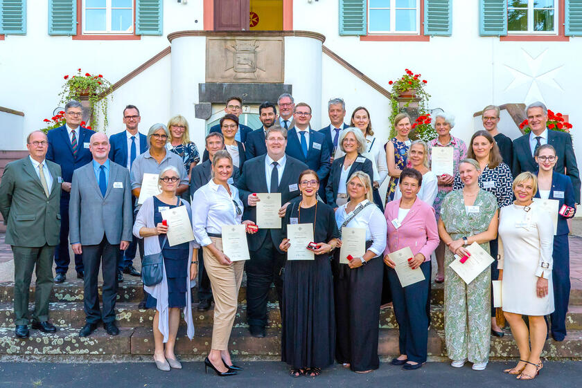 Der Ordensstatthalter des Johanniterordens, Alexander Baron v. Korff, hat am 07.09.2023 haupt- und ehrenamtliche Mitarbeitende des Johanniter-Verbundes sowie Helferinnen und Helfer in Nieder Weisel mit dem neu gestifteten Verdienstabzeichen des Johanniterordens ausgezeichnet. Dieses Verdienstabzeichen wurde geschaffen, um das enorme Engagement von Mitarbeitenden vor dem Hintergrund der gegenwärtigen Herausforderungen, wie z. B. der Corona-Pandemie, der Flutkatastrophe im Ahrtal, internationale Projekte und der Ukraine-Hilfe, besonders zu würdigen.