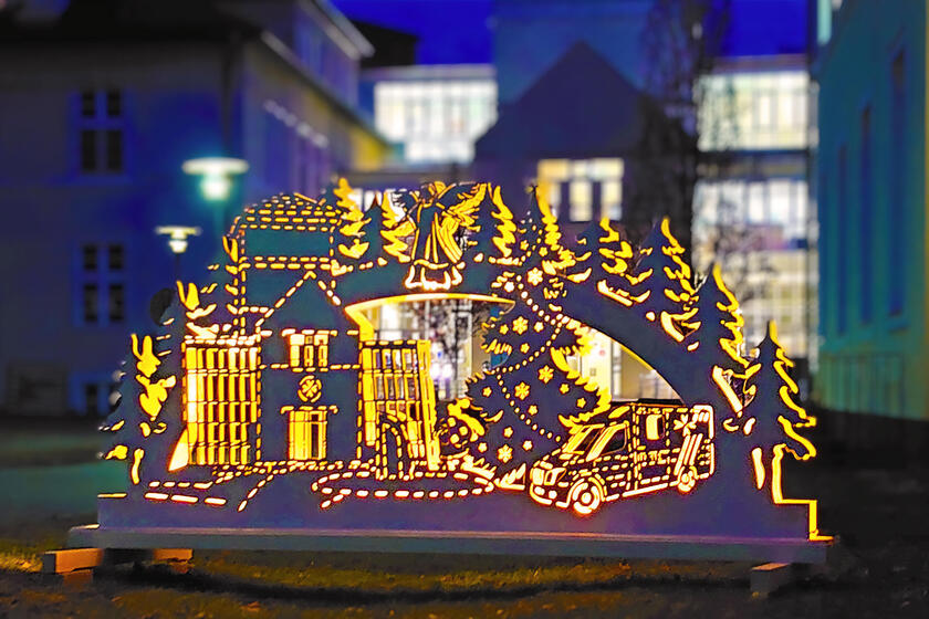 Auch ein echter Hingucker ist der XXL-Schwibbogen. Er sorgt am Haupteingang des Johanniter-Krankenhauses Treuenbrietzen für einen Lichtblick im Advent und grüßt nun jeden, der das Krankenhaus betritt oder verlässt. Zusammen mit der Tischlerei Sven Dienemann aus Beelitz und den Oberlinwerkstätten Potsdam ist der über drei Meter breite und fast 1,50 m hohe Lichterbogen vor der ersten Corona-Weihnacht 2020 entstanden. Damals war das Haus zur Absage aller üblichen Weihnachtsveranstaltungen gezwungen. Darüber sollte der Lichterschmuck etwas hinwegtrösten.