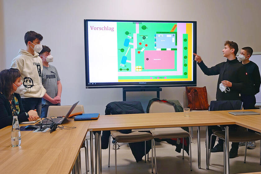Die Wintermonate nutzten die Schüler Raphael, Sebastian, Tiard und Leon aus den Jahrgangsstufen 7 und 8, um an der Präsentation für die Ausgestaltung des Hofes der Psychiatriestation am Johanniter-Krankenhause in Treuenbrietzen zu arbeiten. Um geeignete Pflanzen, aber auch Ideen für die Gestaltung von Bewegungs- bzw. Entspannungsmöglichkeiten für Patienten zu schaffen, recherchierten sie oder interviewten Pflegekräfte. Eine Geländebegehung brachte die Ideen. Diese präsentierten die Schüler am 22.02.2023 stolz den Vertretern des Krankenhauses, unter anderem dem Chefarzt der Psychiatrie Dr. med. Eike Ahlers, den Pflegekräften sowie dem stellv. technischen Leiter. Eine nochmalige Begehung des Geländes half ihren Vorstellungen nochmals Ausdruck zu verleihen. Die Schüler werden nun die kleinen Änderungswünsche in den Plan aufnehmen und dann mit einer Baumschule gemeinsam eine Pflanzenliste erstellen. Ziel ist es, den Monat März zum Setzen der ersten Bäume zu nutzen. Im Rahmen des Ganztages wird die AG nicht nur den Plan umsetzen, sondern auch die Pflege der Pflanzen übernehmen.