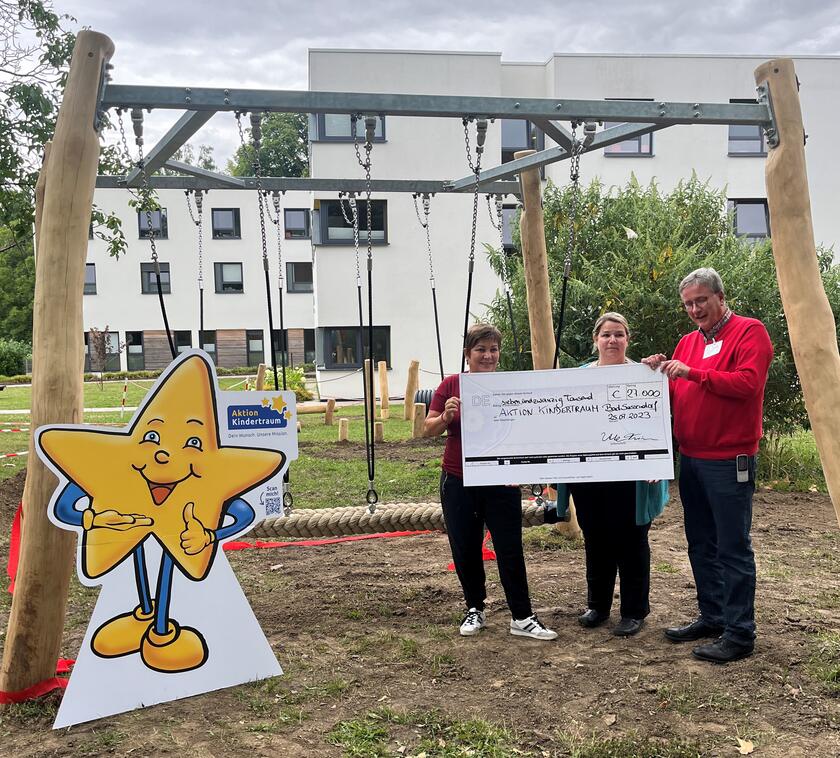 Finanziert wurde die Tampenschaukel von „Aktion Kindertraum“. Die Sozial-Organisation widmet sich seit der Gründung im Jahr 1998 der Kinder-und Jugendhilfe. Gründerin Ute Friese war bei der feierlichen Einweihung anwesend und zerschnitt mit Dr. Matthias Kaminski (Ärztlicher Leiter) das rote Festband. Gemeinsam mit Ihrem Team und dem Twinky- Truck stand Sie Kindern und Eltern zum Gespräch zur Verfügung, damit jene Träume der Kinder möglich gemacht werden können, die sonst meist unmöglich sind.
