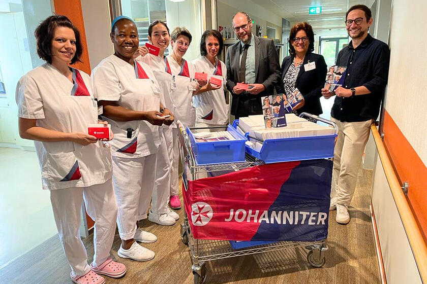 Mit 520 Mitarbeiterinnen und Mitarbeitern ist die Pflege die größte Berufsgruppe in den Johanniter-Kliniken Bonn. Um ihnen für ihren engagierten und professionellen Einsatz für das Wohl der Patientinnen und Patienten zu danken, besuchen der Krankenhausdirektor Helmut Häfner und die Pflegedirektorin Ute Pocha am Tag der Pflege alle Stationen sowie die unterschiedlichen Funktionsbereiche. Als Anerkennung verteilen sie mit Ökostrom geladene Powerbanks. Aber nicht nur in Bonn, sondern in alles Johanniter-Einrichtungen werden heute Powerbanks an die Mitarbeitenden verteilt.