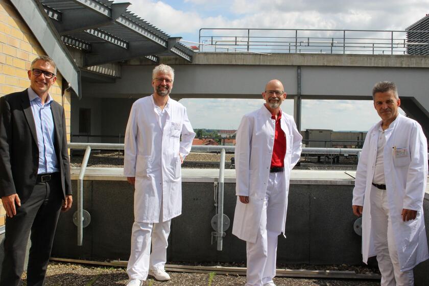 Krankenhausdirektor Michael Schmidt (von links), Dr. Georg Rehmert, Dr. Volker Degenhardt und der Ärztliche Direktor Prof. Jörg Fahlke beim gemeinsamen Fototermin auf dem Dach des Krankenhauses. Foto: Claudia Klupsch