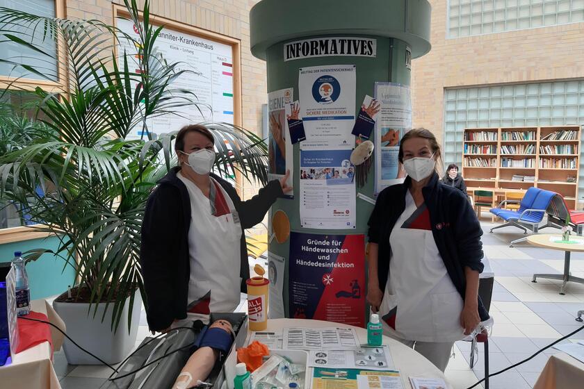 Den „Welttages der Patientensicherheit“ nahm das Johanniter-Krankenhaus zum Anlass, verstärkt auf die Themen Händedesinfektion, sichere Medikamentengabe und Infusionstechnik sowie Personalschutz aufmerksam zu machen. An einem Stand informierte das Team der Krankenhaushygiene -  Ines Konschake und Doreen Yilmaz-Eisermann -  zur Thematik und kam mit über 100 Patientinnen und Patienten sowie Mitarbeitenden ins Gespräch.