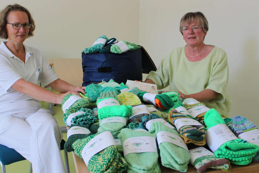 Hintergrund: Der deutschlandweite Verein Eierstockkrebs Deutschland e.V. ruft dazu auf, bei der „Grüne-Socken-Aktion“ mitzumachen. Ziel des Vereins ist es, auf die schwere Erkrankung Eierstockkrebs aufmerksam zu machen und erkrankten Frauen grüne Socken zukommen zu lassen - als Zeichen, dass andere an sie denken. Sigrid Bokelmann ging für die Altmark voran und suchte Kontakt zum Johanniter-Krankenhaus, genauer zu Oberärztin Dr. Beate Koberstein, Koordinatorin des Gynäkologischen Organkrebszentrums. Jüngst übergab sie über 100 Paar grüne Socken. „Ich bin überwältigt, dass sich so viele Menschen beteiligten und fleißig strickten“, so Sigrid Bokelmann. Für ihre Patientinnen freut sich Dr. Beate Koberstein: „Sie werden ein solches Geschenk als Geste zu schätzen wissen“. Beide sprachen ihren herzlichen Dank für die gespendeten Socken aus.
