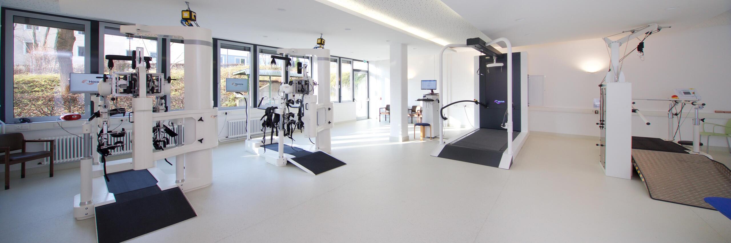 Patienten mit starken motorischen Einschränkungen können mit Robotik therapiert werden. Gehunfähigkeit, schlechte Haltung, Diskoordination der Gliedmaßen oder unzureichende kognitive Funktionen können oft mit einer konventionellen Therapie nicht therapiert werden. Robotikgestützte Systeme können solche Hindernisse überwinden, indem sie die gewünschten Bewegungen unterstützen und kontrollieren. Wir arbeiten mit dem Lokomat. Durch die Schweizer Firma HOCOMA entwickelt, ist der Lokomat ein moderner Gangroboter, welcher die unteren Extremitäten bei besonders schwer betroffenen Patienten führt. Ziel der Therapie ist es, den Patientinnen und Patienten mit Wirbelsäulenverletzungen oder nach einem Schlaganfall auf die Beine zu helfen und wieder das Gefühl des Gehens zu vermitteln.