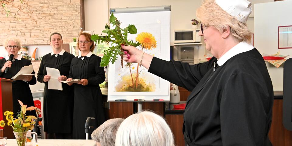 Das Schöne in den Dingen zu sehen, die zunächst als störend wahrgenommen werden, und die Geschenke Gottes zu lieben und mit Dank annehmen - das war die Botschaft der Johanniterschwestern. Mit Löwenzahntee und Löwenzahnhonig konnten die schönen Seiten des Löwenzahns geschmeckt werden und die strahlenden gelben Blüten in den Vasen auf den Tischen zeigten die Pflanze in ihrer gelben Schönheit.