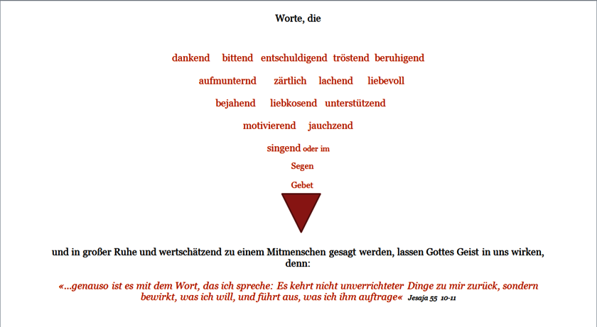 Die Gute Nachricht: "Lasst ja kein giftiges Wort über eure Lippen kommen! Seht lieber zu, dass ihr für die anderen, wo es nötig ist, ein gutes Wort habt, das weiterhilft und denen wohl tut, die es hören" (Eph 4,29).