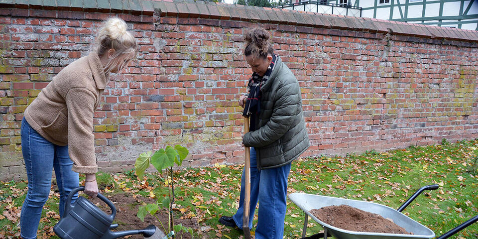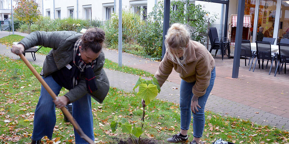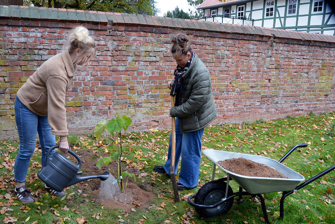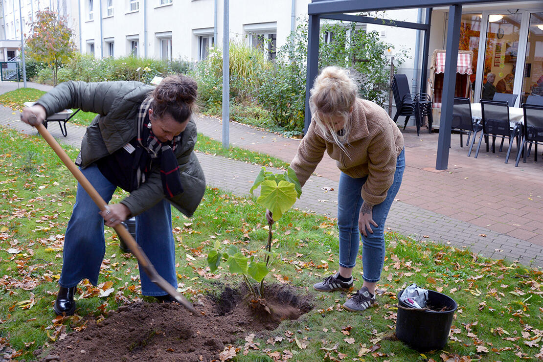 Gemeinsam und mit spürbarer Begeisterung griffen Angelika Ernst und Sina Fischer, Pflegedienstleiterin im Johanniter-Stift Gronau, selbst zum Spaten. Innerhalb der gesetzten Frist wurde der Baum gepflanzt, sorgfältig gegossen und liebevoll in sein neues Zuhause eingebettet.