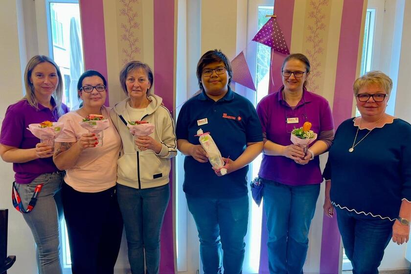 Für den Einsatz bei der Planung und Durchführung des dreitägigen Frühlingsfestes erhielten die Betreuungskräfte als Dankeschön von Einrichtungsleitung Frau Calmes Blumen.
