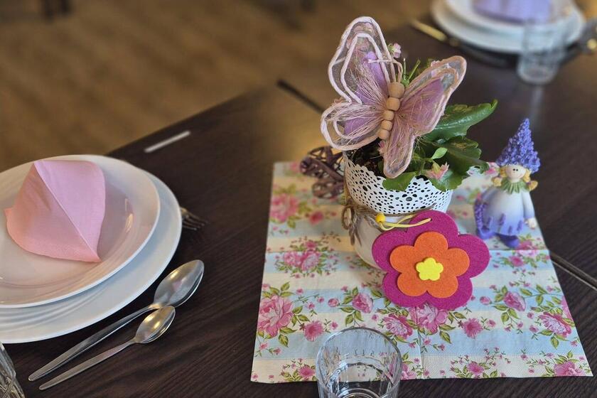 Die Räume waren liebevoll und frühlingshaft dekoriert – bunte Blumen, Schmetterlinge und farbenfrohe Servietten sorgten für eine einladende Atmosphäre. Auch kulinarisch hatte das Fest einiges zu bieten. Zum Mittagessen wurde ein traditionelles Pfälzer Gericht serviert: Kartoffeln mit Hausmacher Wurst, das bei den Bewohnerinnen und Bewohnern großen Anklang fand.