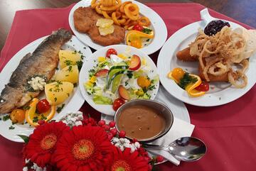 Auch für den Mittag ist gesorgt: Täglich von 12:30 bis 13:30 Uhr servieren wir ein frisch zubereitetes Tagesmenü, das unsere Gäste mit saisonalen und regionalen Zutaten begeistert. Wer es lieber süß mag, kann sich von 15:00 bis 17:00 Uhr im Café bei einer Tasse Kaffee und einem Stück selbstgebackenem Kuchen verwöhnen lassen.