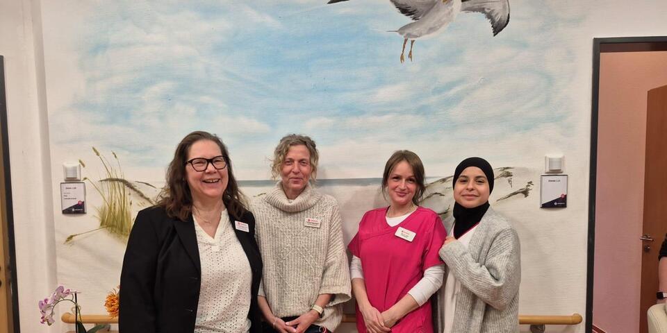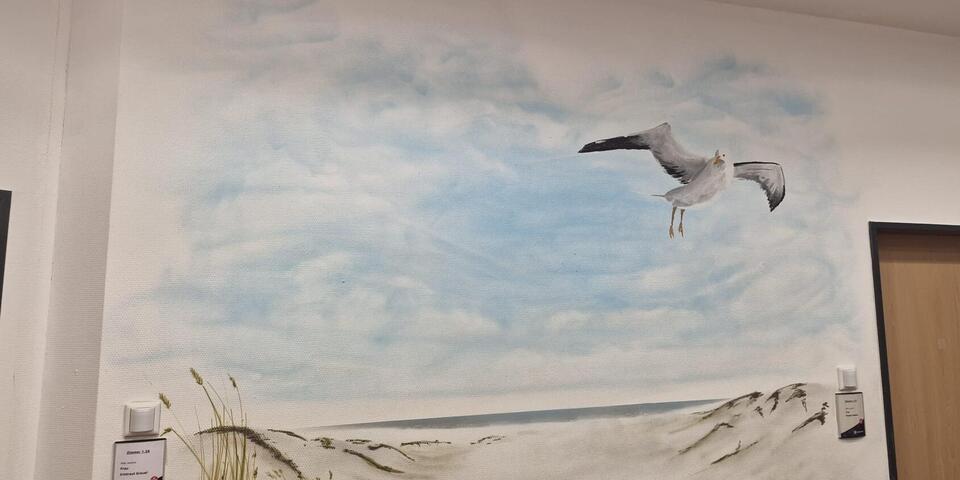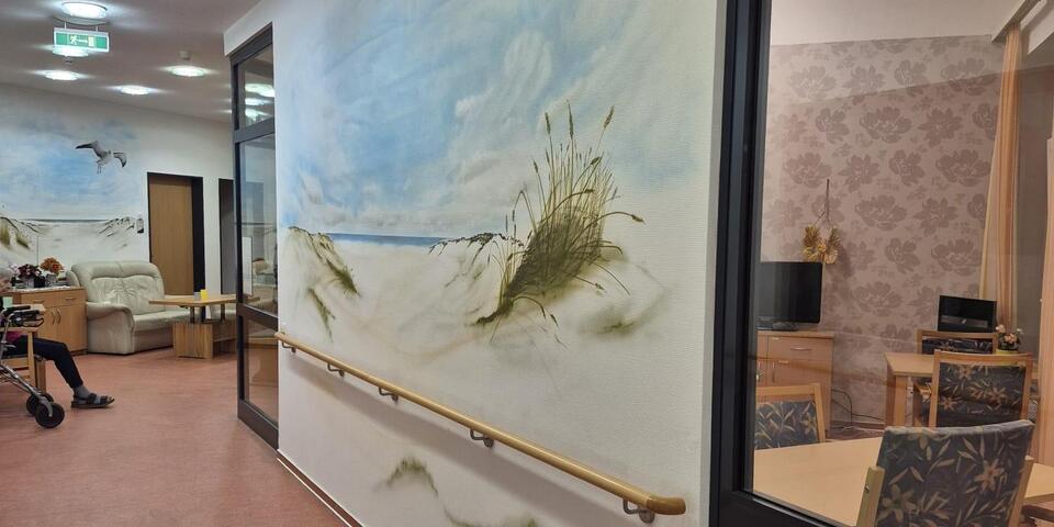 Der Demenzbereich des Johanniter-Stifts am Rosarium in Uetersen erstrahlt in neuem Glanz. In Zusammenarbeit mit dem Bremer Graffiti-Künstler Stephan Dobberphul (420GRAD°) wurden drei großformatige Wandbilder realisiert, die den Wohnbereich durch maritime Motive, Meer- und Dünenlandschaften atmosphärisch aufwerten.