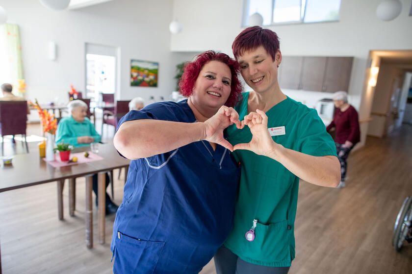 Seit 8 Jahren arbeiten wir zusammen im Johanniter-Haus – aber auf unterschiedlichen Wohnbereichen. Das ist auch besser so. Ich bin ja stellvertretende Wohnbereichsleiterin, als beste Freundin muss ich nicht auch noch ihre Vorgesetzte sein.“