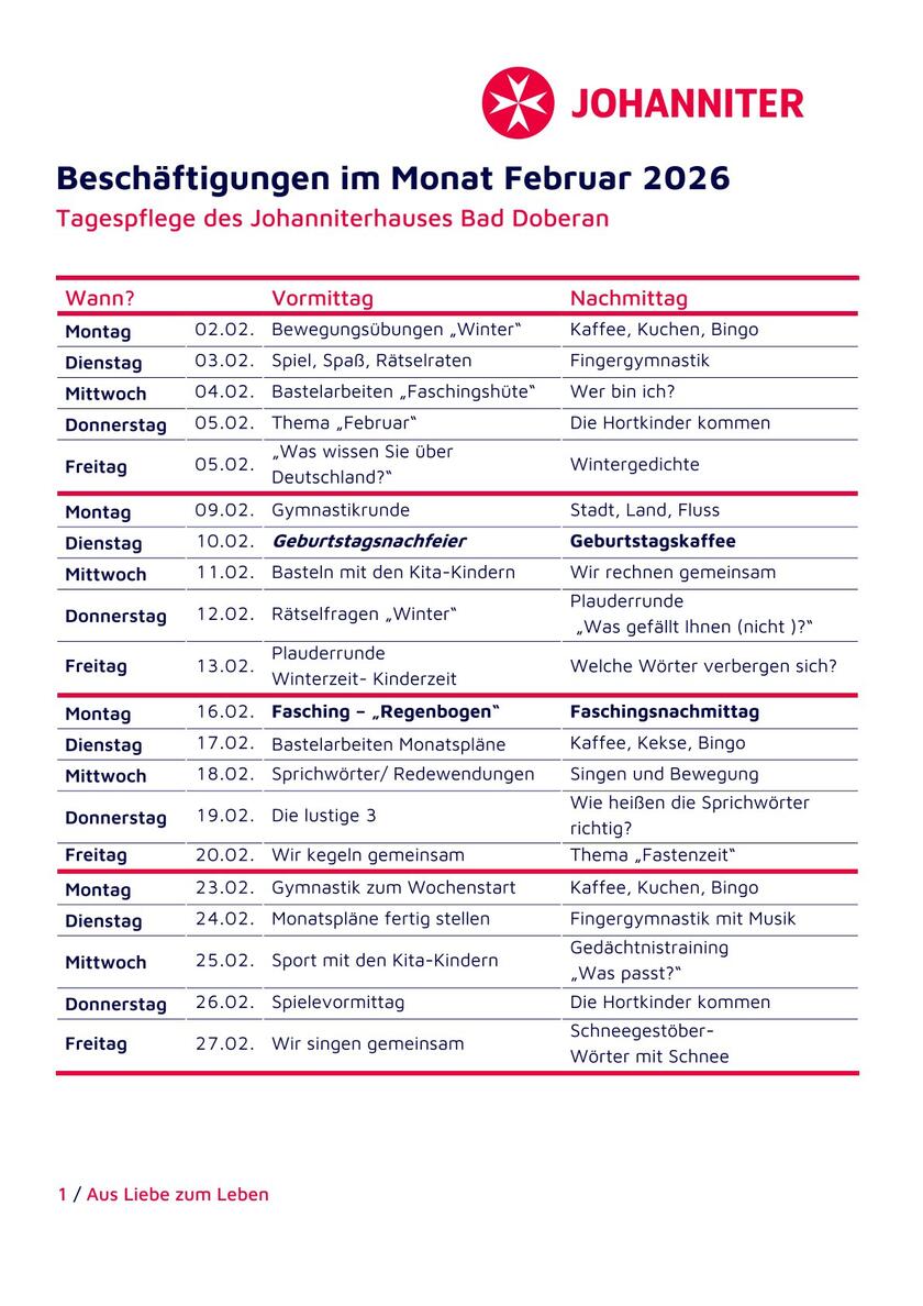 In der Tagespflege haben wir diesen Monat viele verschiedene Aktivitäten geplant. Der Überblick dieser Beschäftigungsangebote steht Ihnen hier zum Herunterladen bereit.