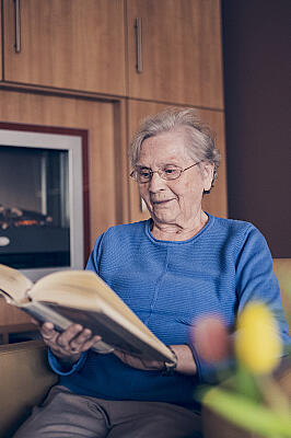 Eine zufriedenen ältere Dame im Johanniter-Stift Gelsenkirchen