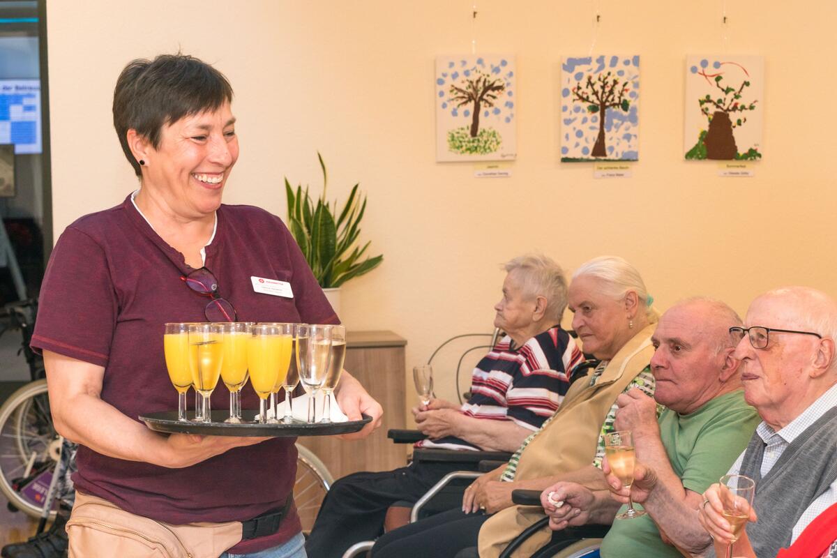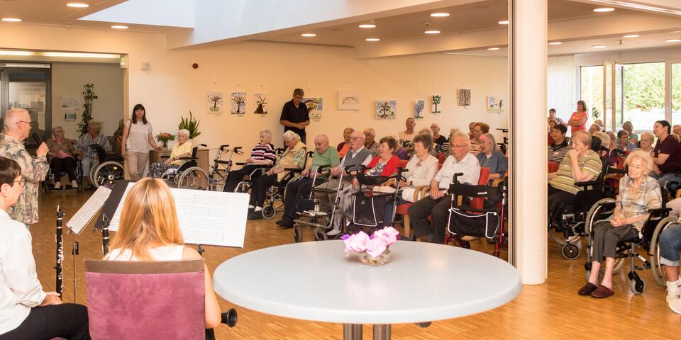 Die Vernissage im Johanniter-Haus kennt einen lockeren Ablauf mit Grußworten und musikalischen Intermezzi, ansprechend klangvoll vorgetragen von einem Klarinettentrio des MV Waibstadt mit Juliane Kiermeier, Katja Sonntag und Lea Stier. Kai Schramm, Einrichtungsleitung, zeigte sich in seiner Begrüßung erfreut über eine große Fangemeinde und dankte sowohl den Künstlerinnen und Künstlern als auch den Verantwortlichen um Ulla Kattermann für ihr Engagement, die Werke ansprechend zu präsentieren. Bürgermeister Joachim Locher lobte dieses außergewöhnliche Projekt, das für die Einrichtung und für die Stadt einen besonderen Akzent setzt. Maltherapeutin Heidrun Fischer-Hamann betonte Ausdauer und Konzentration, Sorgfalt, Einfühlungsvermögen und Entschlussfreudigkeit der betagten Malerinnen und Maler. Nun war sie überrascht von der Wirkung der Arbeiten in ihrer Gesamtheit. Der Freundeskreis hofft auf weitere Spenden, um auch die 13.Malaktion finanziell tragen zu können. Mit köstlichen Häppchen & Sekt beschloss man einen besonderen Nachmittag.“