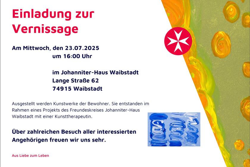 Am Mittwoch, den 23.07.2025 um 16 Uhr findet im Johanniter-Haus Waibstadt unserer alljährliche Vernissage statt. Ausgestellt werden die Kunstwerke unserer Bewohnerinnen und Bewohner, die im Rahmen eines Projekts des Freundeskreises Johanniter-Haus Waibstadt mit einer Kunsttherapeutin entstanden Sind.