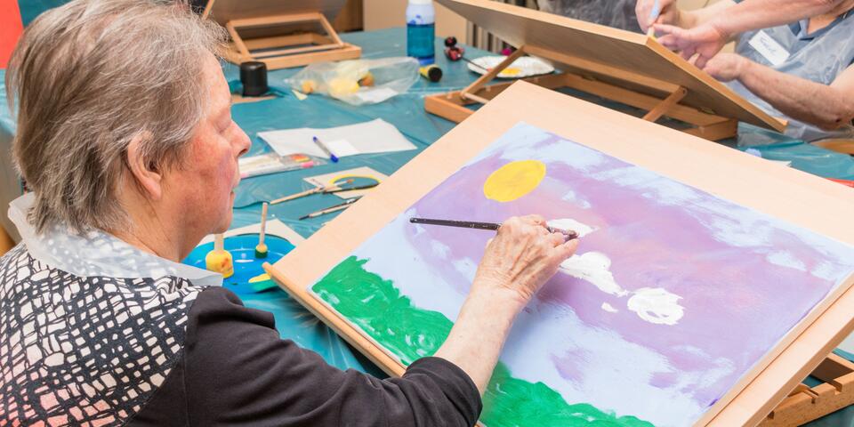 Mut zur Farbe, Mut zum persönlichen Ausdruck, Mut zur Kunst, Mut zur Konzentration – es braucht tatsächlich Mut eine weiße Leinwand zum Kunstwerk werden zu lassen! Seit 2011 ermöglicht der Freundeskreis Johanniter-Haus Waibstadt einmal im Jahr eine therapeutische Malaktion. Mit wechselnden Therapeut*innen gelang es nicht nur, immer neu Freude am Umgang mit Farben, Formen, Techniken zu wecken, es entstanden so auch sehr individuelle und ausdrucksstarke künstlerische Werke. Sie zieren Räume, Flure und finden gegen Spenden auch den Weg zu Freund*innen des Hauses. Diese Möglichkeit setzt allerdings voraus, dass die künstlerischen Arbeiten einer breiteren Öffentlichkeit zugänglich gemacht werden. Eine solche Vernissage, eine Ausstellung der aktuellen Werke, kann in diesem Jahr wieder ohne Einschränkungen stattfinden. Lassen Sie sich diesen besonderen Termin am Mittwoch, 26.Juli ab 16:00Uhr nicht entgehen! Maltherapeutin Heidrun Fischer-Hamann hat in ihrer therapeutischen Begleitung die Themen „Sommer“ und „Sommerhimmel“ angeregt, und man darf auf die Ergebnisse gespannt sein. In drei Malgruppen sind interessante Bilder aus neuem Blickwinkel entstanden, denn erstmals konnte man an Tisch-Staffeleien arbeiten und hatte das Entstehen des Werkes direkt vor Augen. Machen Sie sich selbst ein Bild bei der Vorstellung des Malprojekts in der 11.Vernissage, nehmen Sie die Gelegenheit für diese wertschätzende Begegnung wahr, freuen Sie sich an der bunten Vielfalt von Farben und Formen und hören Sie die muntere Musik des Klarinettenquartetts des MV Waibstadt unter der Leitung von Luis Flaig.