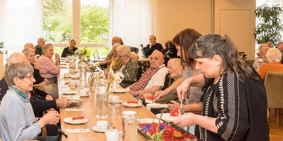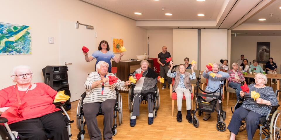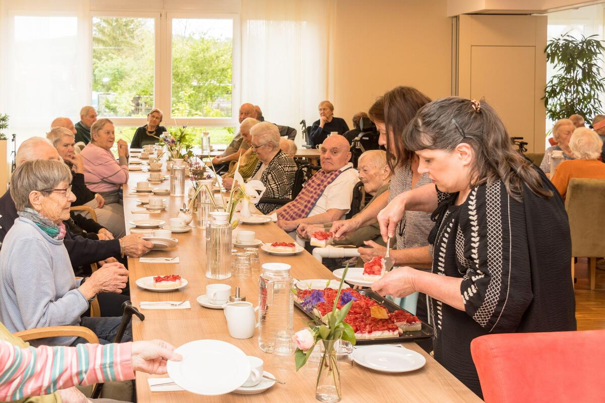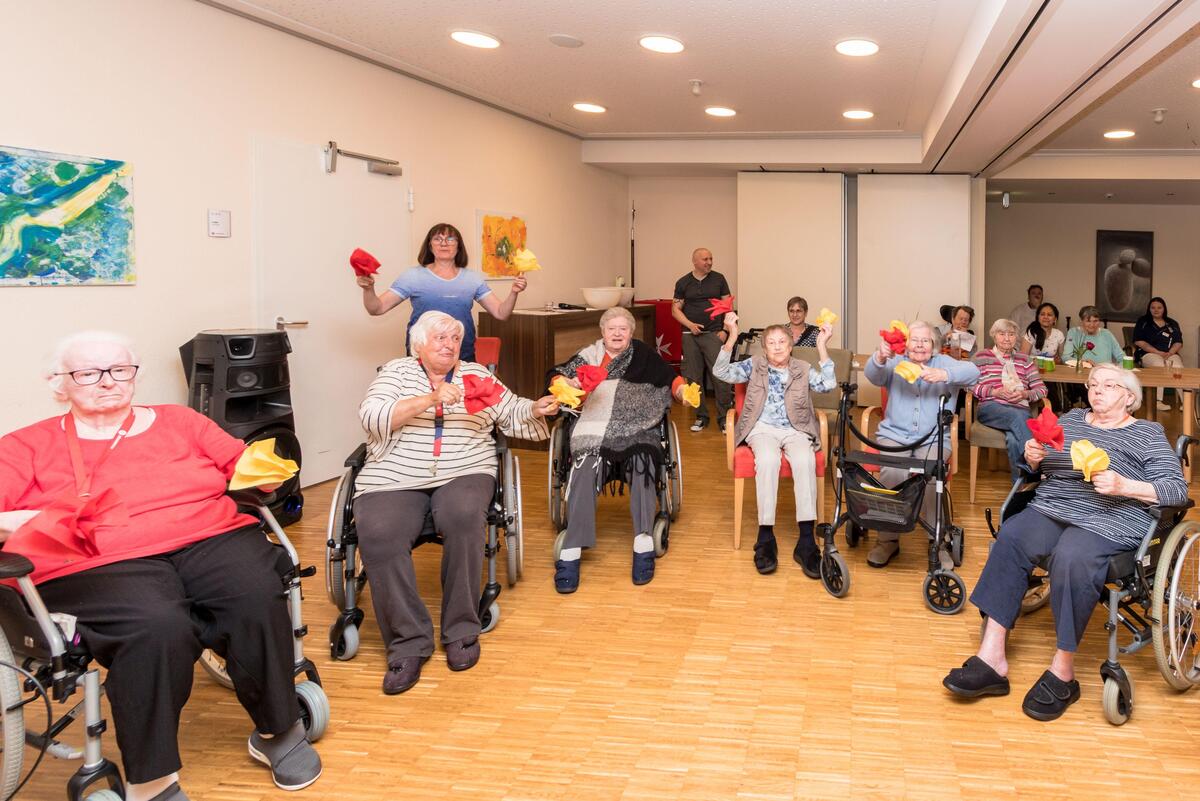 „Horch, von fern ein leiser Harfenton“, so wird in Eduard Mörikes Gedicht der Frühling angesagt. Im Johanniter-Haus Waibstadt übernahm es Philipp Butschbacher mit seiner Mundharmonika, beim Maifest den Frühling zu begrüßen, noch bevor Irmgard Franke mit „Er ist’s“ den Reigen der Programmbeiträge eröffnet hatte. In sehr großer Runde hatte sich dieser Tage die Hausgemeinschaft in der Cafeteria zum traditionellen Maifest versammelt. Silvia Weis führte durch ein Programm, das ohne Ausnahme von Bewohnerinnen und Betreuenden gestaltet war. Schwungvoll wurde ein Sitztanz vorgeführt, dessen Melodie „Tulpen aus Amsterdam“ begeistert mitgesungen wurde. Hansi Desch erzählte stimmungsvoll die Geschichte des Apfelbaums in seiner späten Blütenpracht, und eine „Maiwanderung“ als Pantomime dargestellt, forderte die ganze Aufmerksamkeit. Ein Maifest kommt nicht aus ohne zahlreiche Mailieder und auch nicht ohne köstliche Erdbeerschnitten und erfrischende Maibowle. Man feierte einen genussvollen Nachmittag, und der war nur einer von mehreren zum Monat Mai zählenden Sonderaktionen! Dazu gehören der Besuch der Gartenbörse auf dem Gelände der Realschule Waibstadt mit der Einladung zu einer Kaffee-Kuchen-Runde und einem Singkreis mit Schüler*innen und Lehrer*innen; am Vatertag wartete ein zünftiges Weißwurst-Frühstück auf Bewohner mit Angehörigen; da durfte am Muttertag für Bewohnerinnen und deren Gäste ein exklusives Kaffee-Kuchen-Arrangement nicht fehlen!