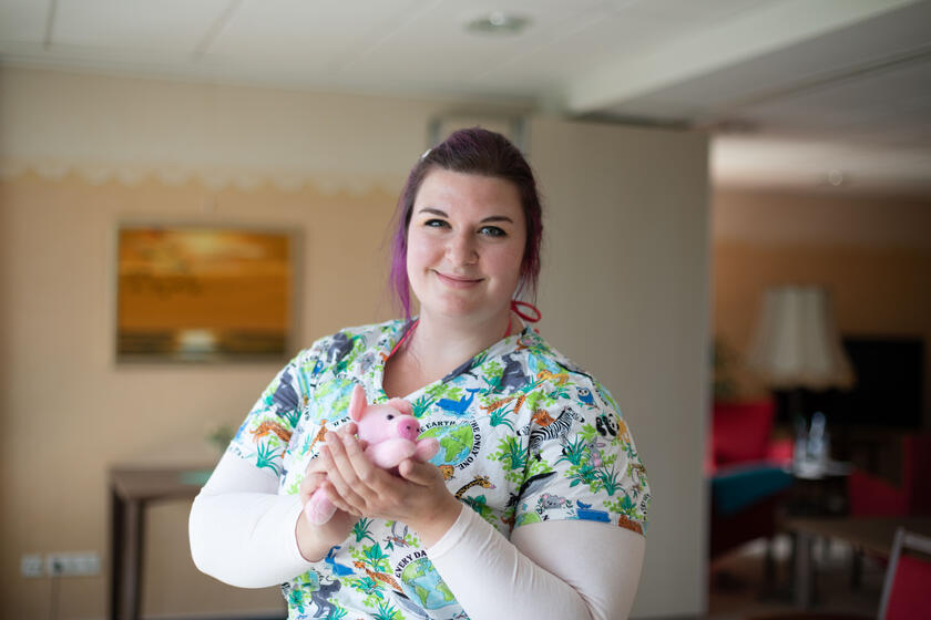 „Wenn Leute mich fragen, wie es ist, in einer Altenpflegeeinrichtung zu arbeiten, erzähle ich am liebsten die Geschichte von Schnitzel: Anfang des Jahres gaben eine demenziell erkrankte Bewohnerin und ich ihrem neuen rosa Plüsch-Schwein den Namen „Schnitzel“. Wir lachten herzlich. Ein paar Monate vergingen, bis wir uns wiedersahen. Als ich sie wieder pflegen durfte, erkannte sie mich nur bedingt. Dennoch begrüßte sie mich mit den Worten: ‚Pass bitte gut auf Schnitzel auf, der darf nicht nass werden!‘ Natürlich hatte die Bewohnerin meinen Namen durch ihre Erkrankung nicht behalten – aber die Erinnerung an Schnitzel ist geblieben. Situationen wie diese erfüllen mich mit unendlich großer Freude.