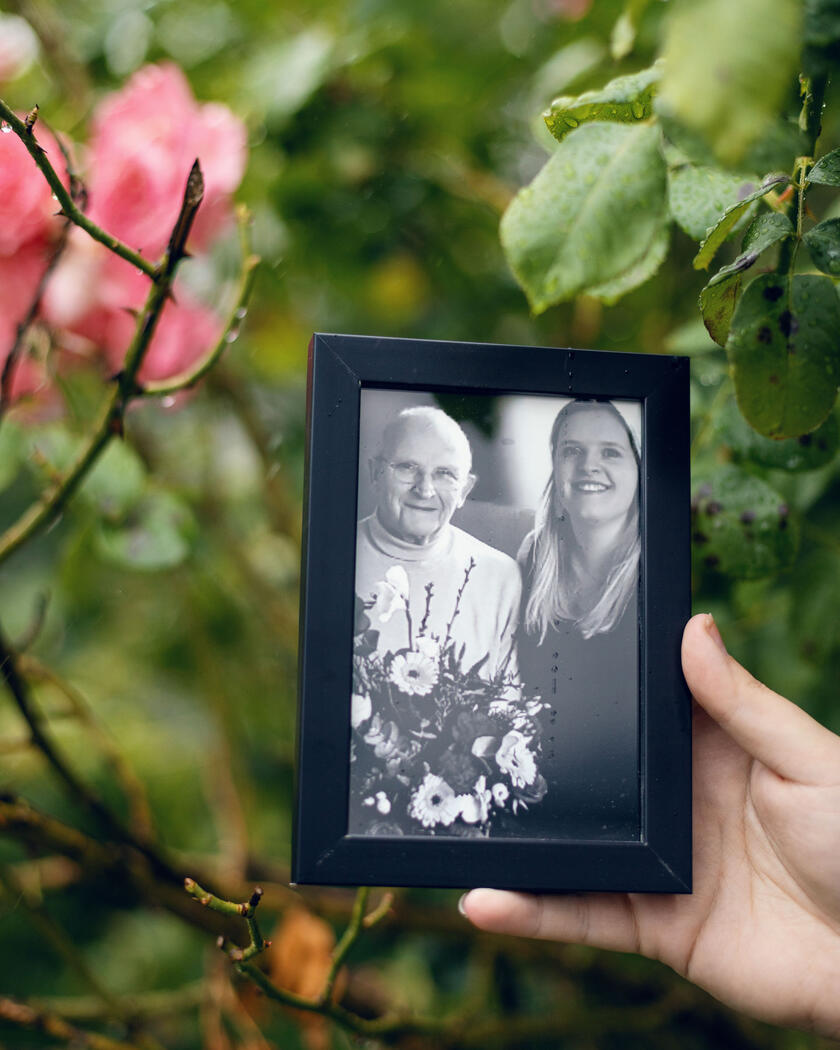 „Wenn ich heute an meinen Opa denke, weiß ich, dass er da ist und von oben alles sieht. Opa und ich hatten schon immer eine besondere Verbindung. Als meine Zwillingsschwester und ich noch Kinder waren, haben wir oft die Ferien bei unseren Großeltern im Fichtelgebirge verbracht. Sie lebten in einem 150 Jahre alten Haus, das vermutlich schon immer in Familienbesitz war. Opa ist in diesem Haus aufgewachsen. Nachdem er wegen eines Arbeitsunfalls in Frührente ging, ist das Haus für ihn zu einer Art Lebensinhalt geworden. Er hatte jede Fuge, jede Ecke im Blick, hielt jeden Millimeter liebevoll in Stand. Das Haus hatte einen großen Garten, mit Vogelhäuschen und einem Teich, in dem seine Fische umherschwammen. Vor allem aber gab es Blumen. Denn Opa züchtete mit viel Liebe Dahlien und Rosen. Irgendwann wuchsen dort 120 verschiedene Rosensorten!
