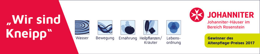 Eine familiäre, liebevolle Umgebung individuell erleben: In den Johanniter-Pflegewohnhäusern am Rosenstein haben wir schon immer Wert auf ein Höchstmaß an Lebensfreude im Alter gelegt. Mit Einführung des Kneipp-Gesundheitskonzeptes steigern wir diese noch. Denn aus dem ganzheitlichen Ansatz der Kneippschen Lehre ergibt sich für uns und unsere Bewohnerinnen und Bewohner ein ganzes Spektrum neuer Möglichkeiten, um ein Mehr an Lebensqualität zu vermitteln und zu erlangen. Überzeugen Sie sich selbst: