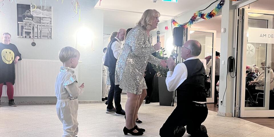 Auch unsere Mitarbeitenden trugen mit dem Sketch „Sparmaßnahmen im Altersheim“ zur heiteren Atmosphäre des Nachmittags bei und sorgten mit humorvollen Szenen für viele Schmunzler. Für das passende Karnevalsgefühl durften natürlich auch Sekt und frisches Popcorn nicht fehlen – eine Kombination, die bei Bewohnern und Angehörigen gleichermaßen gut ankam.