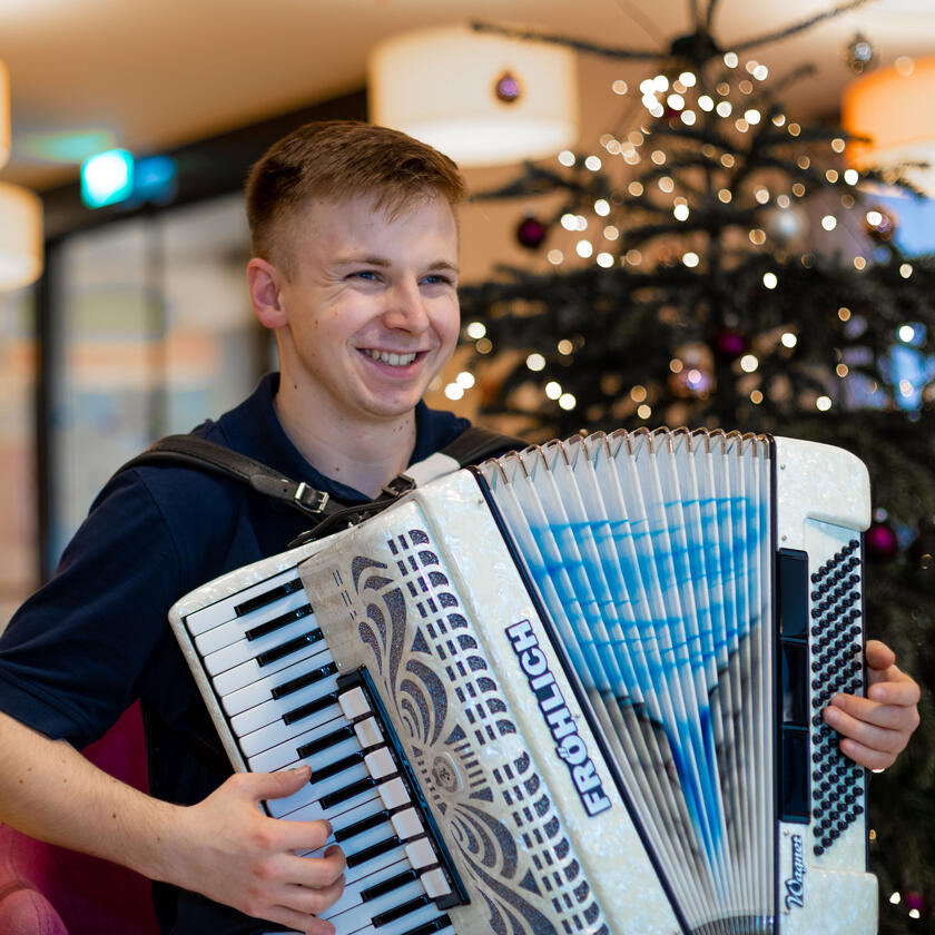 Die vielseitigen Lerninhalte sind nicht nur für seine spätere Berufslaufbahn von Vorteil. Sie passen auch wie die Faust aufs Auge zu Oles Persönlichkeit. Der junge Mann scheut nie, ins kalte Wasser zu springen. Egal, ob es darum geht, Kolleginnen und Kollegen zur Hand zu gehen oder ein weihnachtliches Solokonzert zu geben. Und auch, wenn Ole das Johanniter-Stift nach einigen Monaten wieder verlassen muss, steht fest: Er und sein Akkordeon wollen auch nächstes Jahr zurückkehren, um allen ein Lächeln ins Gesicht zu zaubern.
