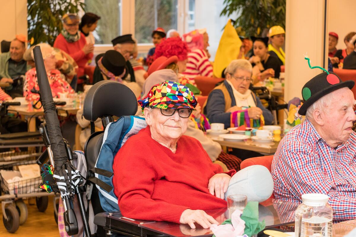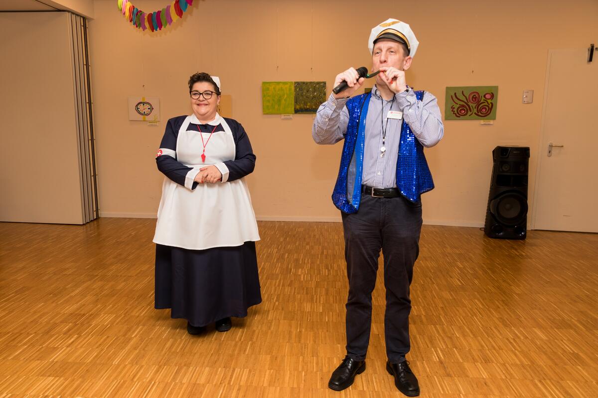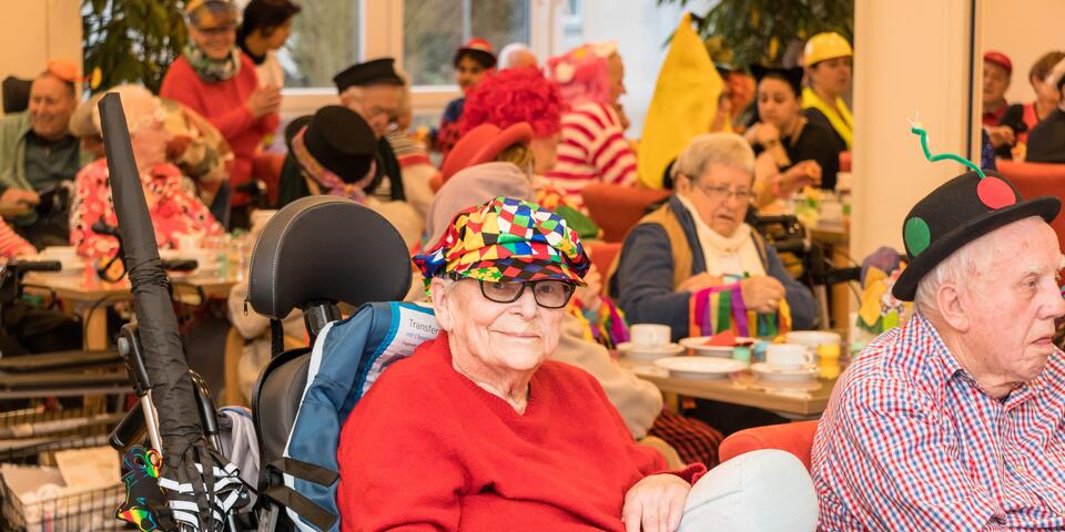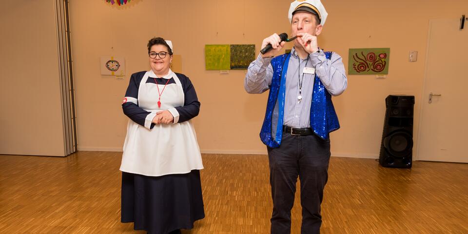Einrichtungsleitung Kai Schramm mit Kapitänsmütze übernahm die Begrüßung des närrischen Auditoriums und übergab dann an Silvia Weiss, die durch ein buntes Programm führte. Wie in den vergangenen Jahren sorgten Achim Löffler und seine Frau Christiane für den musikalischen Schwung. Die Küche begeisterte zu Beginn mit süßen Berlinern zum Kaffee, verführte dann mit Eierlikör in mehreren Variationen und servierte am Ende des närrischen Nachmittags duftende Pizzaschnitten mit diversem Belag. So gesehen bestätigte bereits der erste Programmpunkt „Gute Laune Song“ die Zielsetzung des Nachmittags. Die Damen und Herren aus Pflege und Betreuung hatten keine Mühe gescheut, sich selbst und noch viel mehr die Seniorinnen und Senioren in ein fasnachtlich buntes Outfit zu stecken, in dem sie sich wohl fühlten. Was auf der Bühne geboten wurde, wurde mit viel Applaus belohnt, ob es ein gereimter Vortrag zu dem peinlichen Thema „Flatulenzen“ oder eine „Zauberschau“ mit wahrhaft verblüffenden Tricks war. War das „Männerballett“ zahlenmäßig noch überschaubar, stürmten bei „Alice im Wunderland“ gleich neun Figuren auf die Bühne, um unter der Filmmusik die Begegnungen von Alice mit Menschen und Tieren mimisch darzustellen. Die Schritte und Sprünge des Männerballetts gipfelten in einem „Stütz-Dreh-Effekt“ mit ihrer Ballerina; diese wurde von Sonja Trunzer gespielt, die mit großem Schwung gleich in mehreren Programmpunkten mitwirkte! Der Besuch des Carnevalclubs Bargen mit Bambinis, Minigarde und zwei Tanzmariechen musste als ein besonderer Glanzpunkt des bunten Treibens gewertet werden, weil Kinder mit ihrem quirligen Leben die Herzen erobern und fröhliche Stimmung zaubern. Dazu noch eine Runde Polonaise mit und ohne Rollator oder ein Tänzchen im Rollstuhl, und der Tag war perfekt!