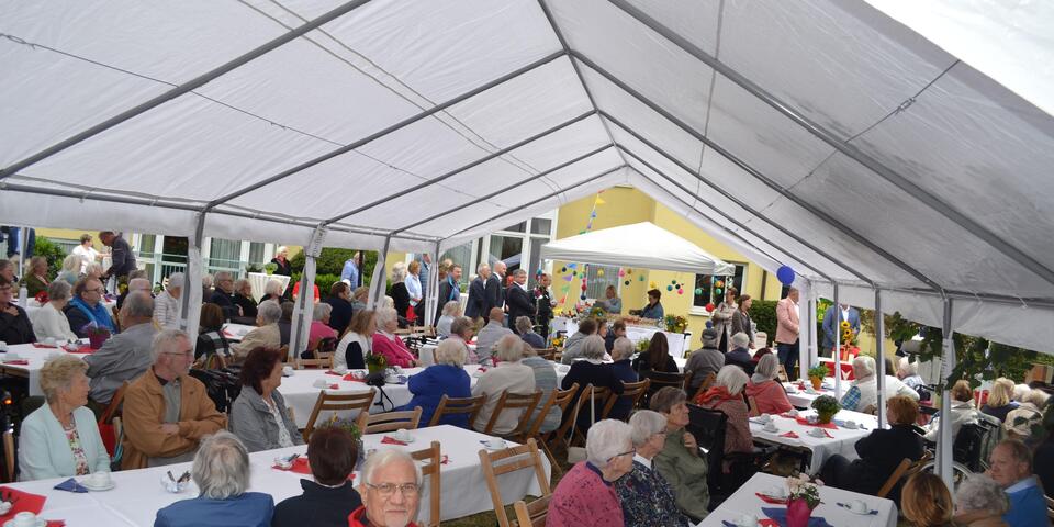 350 geladene Gäste, Angehörige und natürlich unsere Bewohnerinnen und Bewohner fanden sich um 14 Uhr zur Andacht im Garten ein, die das Fest feierlich eröffne. Danach gab es Grußworte von Tim Geikowski, unserem Einrichtungsleiter, Andreas Markurth, dem Stadtbezirksbürgermeister und Mitglied des Kuratoriums sowie von Christoph Laube und Martina Heyen, Niederlassungsleitung aus dem Regionalzentrum Bremen, der Johanniter Seniorenhäuser GmbH. Alle hielten sich kurz, denn parallel wehte bereits der Kaffeeduft durch den Garten. Für die anschließende Unterhaltung sorgte neben einem DJ auch eine Fotobox mit Verkleidungselementen. Außerdem gab es für die Gäste im Holzhaus eine Fotoausstellung mit Schnappschüssen der letzten 25 Jahre und in unserem Kino einen Film mit und über Ricky. Mit einem Glas Sekt in der Hand ließ es sich gut durch den schön geschmückten Garten bummeln. Die Kleinen und Junggebliebenen vergnügten sich auf der Hüpfburg im Garten und trotz des kühleren Wetters war der Eiswagen durchgängig gut besucht.