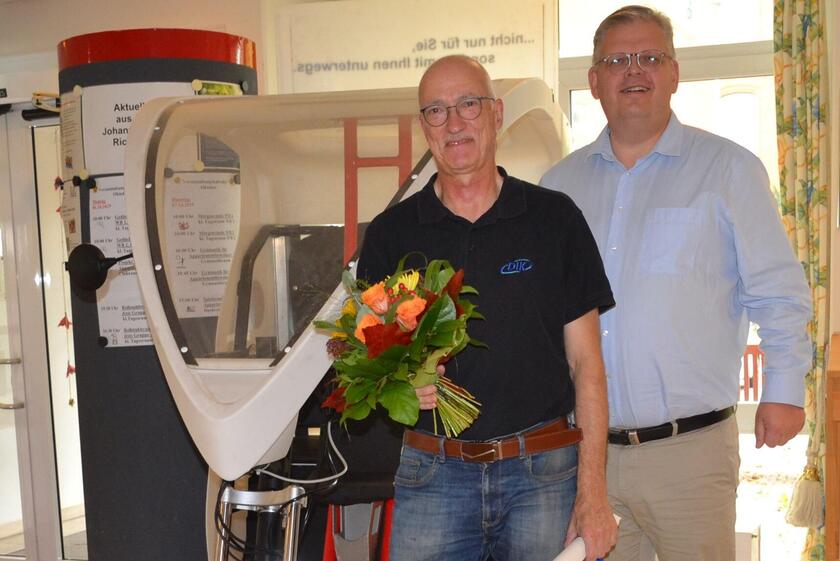 Seit Sommer 2024 hatte unsere schöne Rikscha einen technischen Defekt, der leider auch nach einem mehrmonatigen Aufenthalt in einer Fachwerkstatt nicht behoben werden konnte. Aber selbst ist der Mann beziehungsweise der Angehörige Frank Czember, Sohn eines Bewohners in unseren Appartements. Er bot sich an, dem Problem auf den Grund zu gehen. Zweieinhalb Monate und diverse Arbeitsstunden in seiner Freizeit später hat uns Herr Czember die Rikscha voll funktionstüchtig zurückgebracht. Zum Dank erhielt er von Tim Geikowski, unserem Einrichtungsleiter, unter anderem einen herbstlichen Blumenstrauß. Die Freude, auch bei unseren Bewohnerinnen und Bewohnern, ist groß und wir hoffen auf schöne Tage im Oktober, um die Rikscha wieder nutzen zu können.
