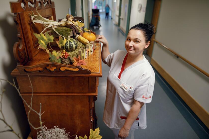 Patricia ist Pflegefachkraft, Mutter, derzeitige Stationsleitung und tritt mit zehn Stunden wöchentlich nun auch langsam in die Fußstapfen der Pflegedienstleitung ein. Aber von Anspannung kann man in ihrem offenen Gesicht kaum eine Spur entdecken. „Egal, wie schwierig es auch manchmal ist, mit gutem Beispiel voranzugehen und seine Arbeit vernünftig abzuliefern – das ist mir schon wichtig und klappt bis zu einem gewissen Grad auch immer“, sagt sie. Doch die Begeisterung für ihre Arbeit geht noch ein bisschen darüber hinaus: Abgesehen von den pflegerischen, administrativen und leitenden Aufgaben dekoriert Patricia beispielsweise jede Saison aufs Neue liebevoll die Flure der Wohnbereiche. „Manchmal brauche ich eine Woche, um die nächste Jahreszeit auf dem Wohnbereich einziehen zu lassen“, erklärt sie und fügt dann noch schnell hinzu: „Natürlich ist es viel Arbeit, aber ich finde das so schön, wenn die Bewohnerinnen und Bewohner über den Flur gehen und allerlei kleine Deko im Haus entdecken“, bekräftigt sie begeistert.