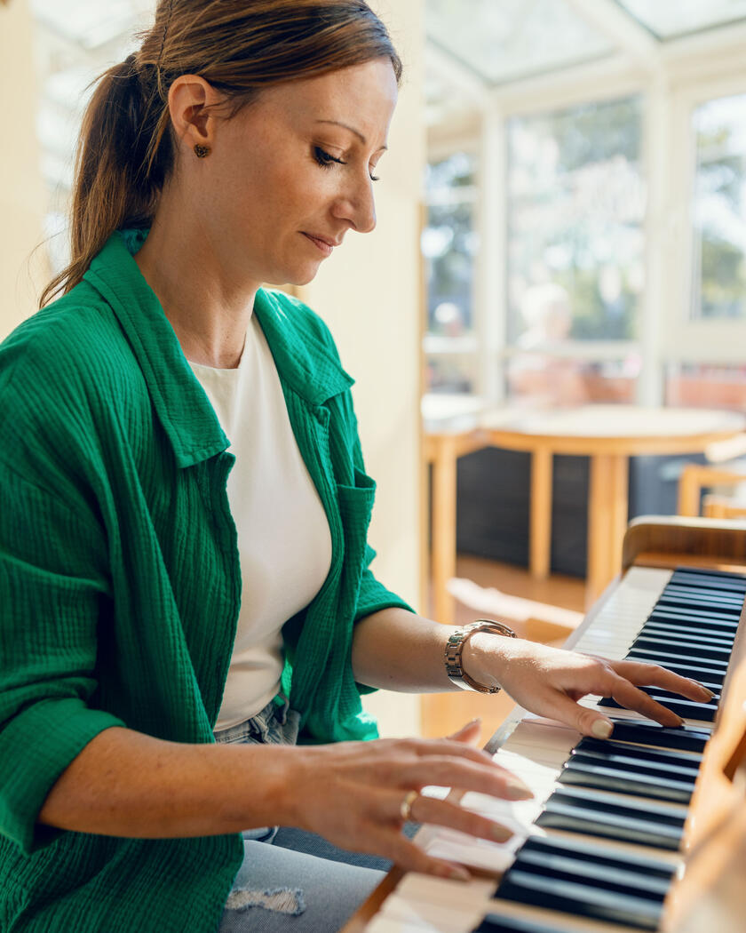 Wenn ich den Kopf frei bekommen will, dann spiele ich Klavier. Ich habe zwar nie Unterricht gehabt – aber ich habe damals viel von meiner besten Freundin gelernt. Als meine Tochter dann vom Weihnachtsmann ein Klavier geschenkt bekommen hat, ging damit auch für mich ein großer Traum in Erfüllung. Abends mit Kopfhörern am Klavier sitzen und mir die Lieder selbst beizubringen während mein Mann auf dem Sofa sitzt – das ist für mich abschalten, mein Moment, das mache ich einfach unglaublich gerne.